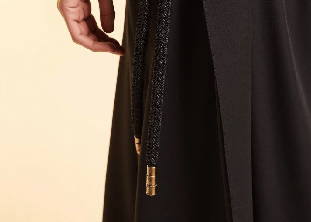 Cord closures are braided in-studio using the kumihimo method — strand on strand, weighted on individual bobbins. The ends are finished with cold-cast brass.